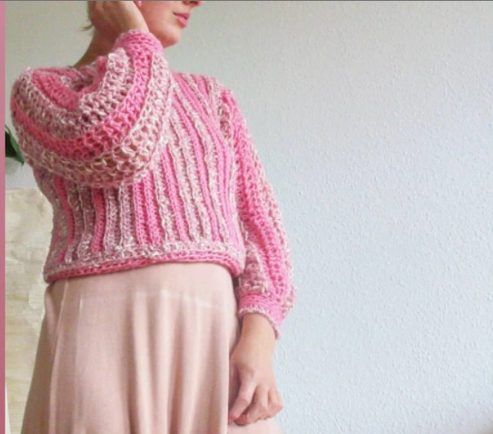 Here’s an example of a crochet top with long sleeves and rib, where I only inserted elastic in one area of the sleeve – the top edge – this way it holds the sleeve in place plus makes it a more comfortable crochet blouse top wear.
