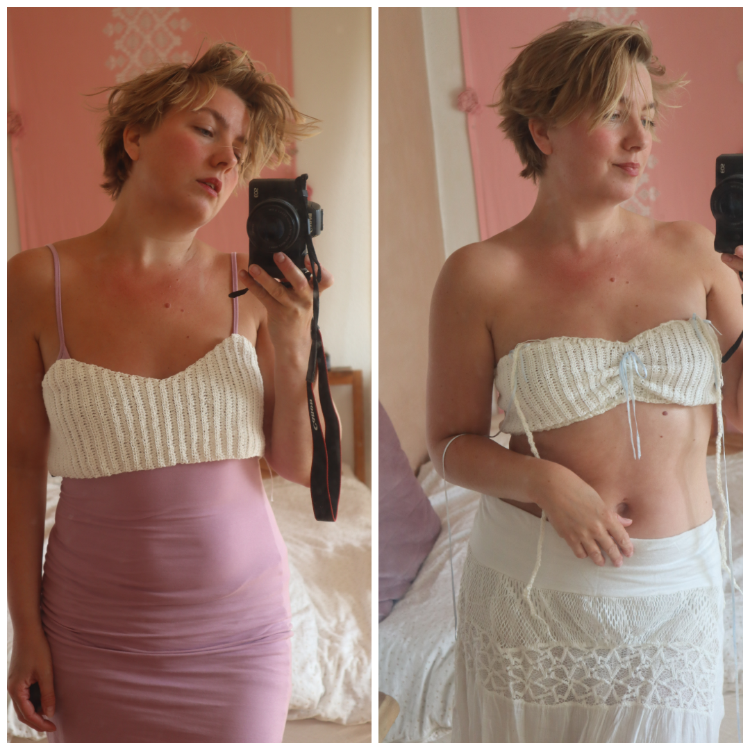 You will need to follow Zoey top in order to make this version, but you don’t need to subtract from your measurements. We need the extra fabric. I used the same yarn and hook as the pattern, but I also used some baby blue ribbon yarn and some white bouclé yarn for the edge – simply because I only had secondhand yarn. The bouclé added another shade of white and also a different texture, I liked that. For the top I even used two different shades of white – it’s okay – an imperfect top is just as beautiful.