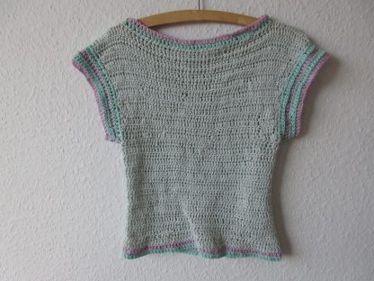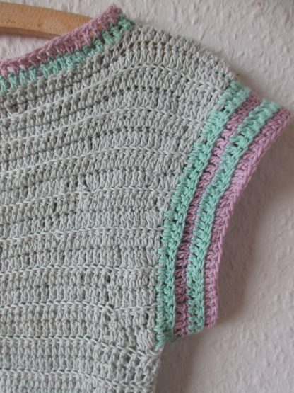 This is t-shirt inspired by the vintage crochet from the 1940’s where the crochet tops and sweaters had a particular shape to them – they were wide at the shoulders. I find them very flattering, especially if you, like me, have small or narrow shoulder and need more action on the shoulder area!
