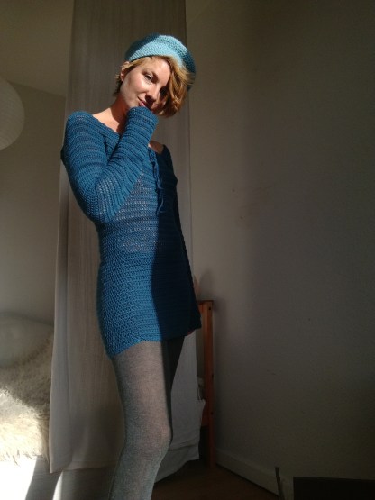 If you make the straps long as mine, you can also wear it as an off-shoulder dress (tying the straps in the neck). The dress is see-through, so it’s a good idea to make it in a dark color, so that you can wear stockings/leggings under and an undershirt! I