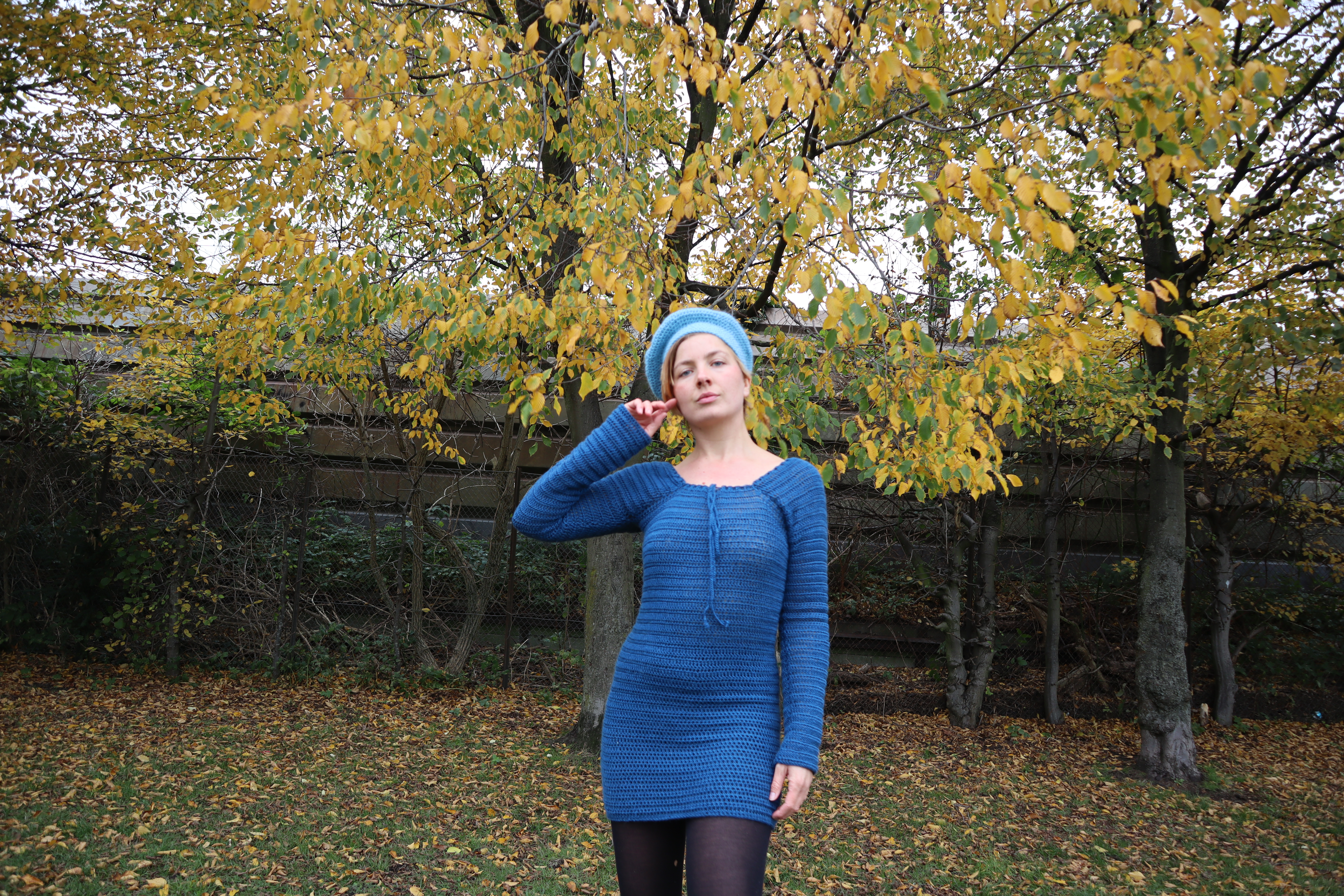 A crochet pattern for a bodycon dress with a tight fit, where you learn how to crochet a winter mesh dress with long sleeves and drawstring going through sleeves and dress.