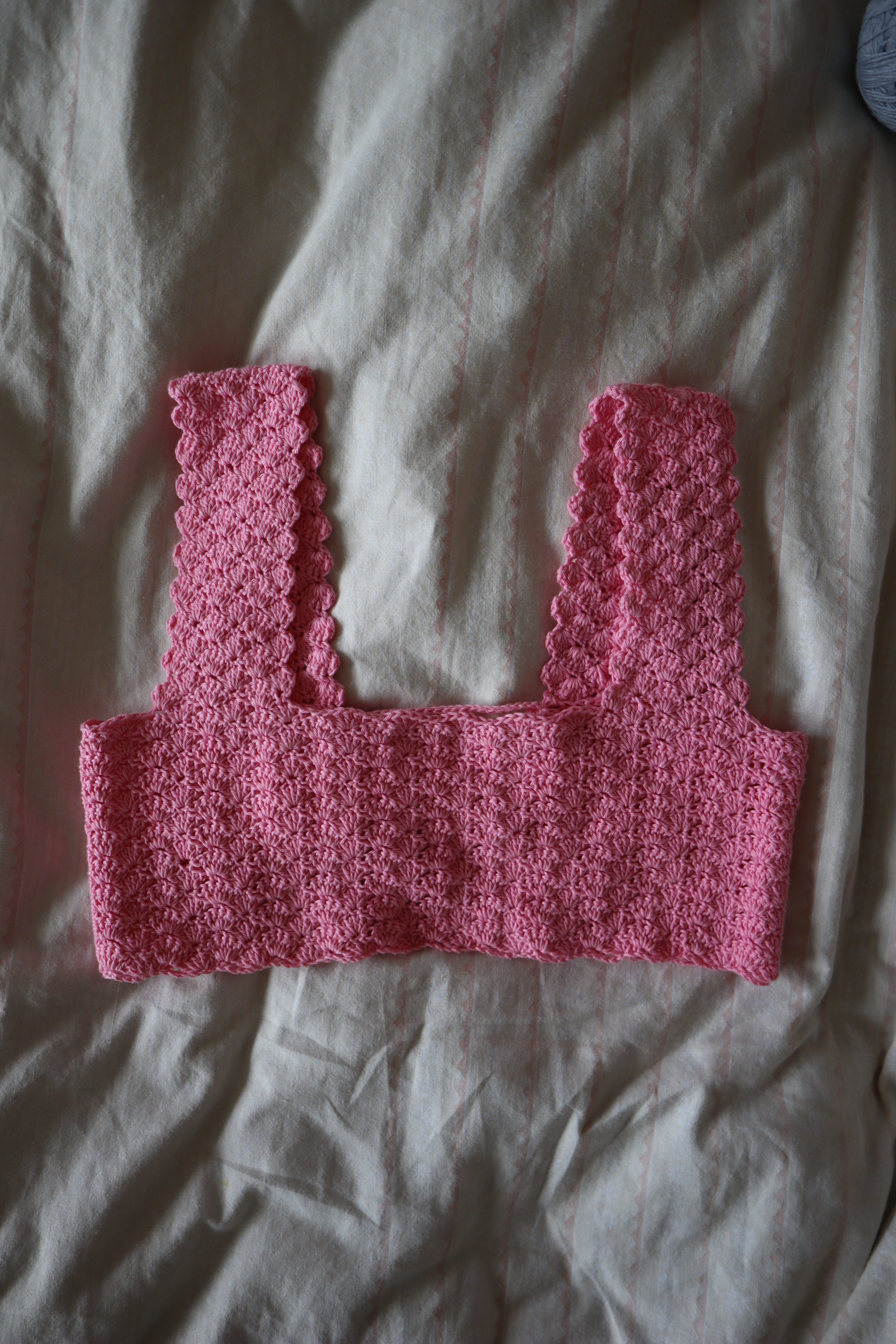 A crochet pattern so you can learn how to crochet a cropped romantic, textured shell stitch top with laced up back and wide straps. The top is very vintage like.
