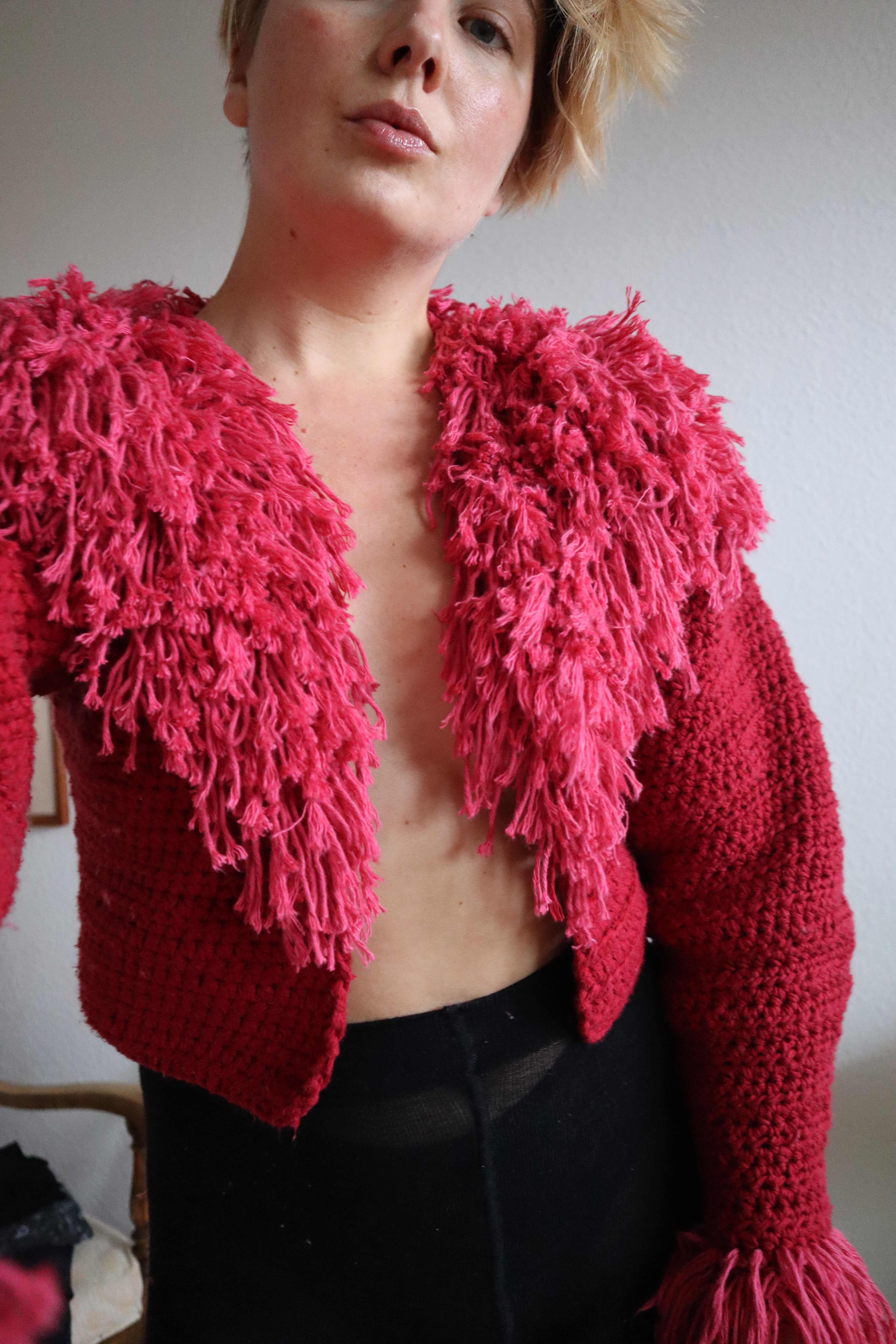 A crochet pattern to learn how to crochet an open jacket with fauc fur fluff collar and sleeve edge. The jacket is a perfect Spring or Autumn jacket or could be used as a cardigan. The pattern follows measurements so it can be made in any size and length an the size and length of the collar can be adjusted as well.
