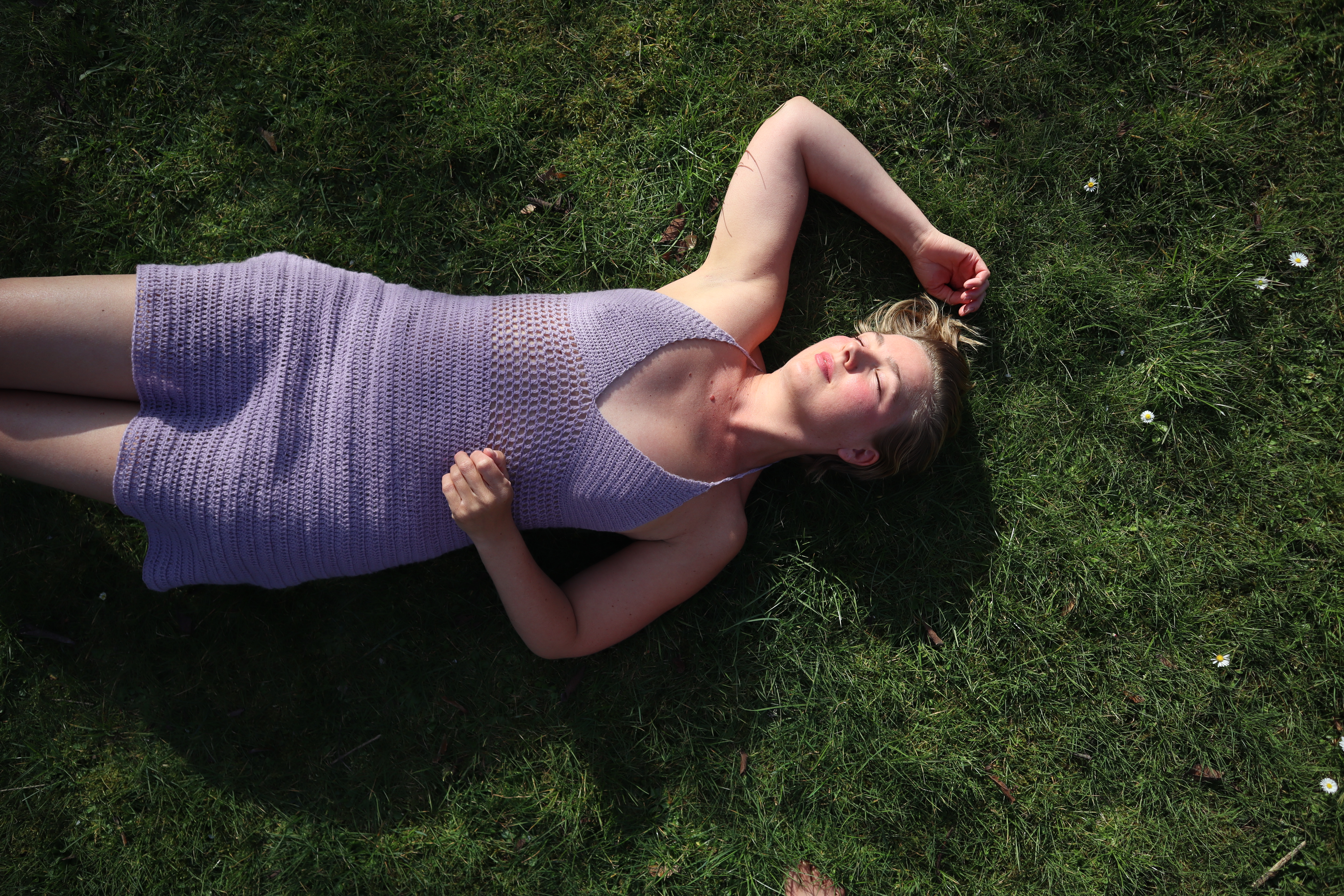 A crochet pattern where you learn how to crochet this striped bra cup dress with mesh body, slim straps and slightly A-line skirt. The pattern is simple and easy to follow and uses your measurements – this way you can make it for any size and length you’d like. You can also make the skirt more tight fitted and longer if you want. Just add about 1 yarn skein if you want an extra 10 cm in length.