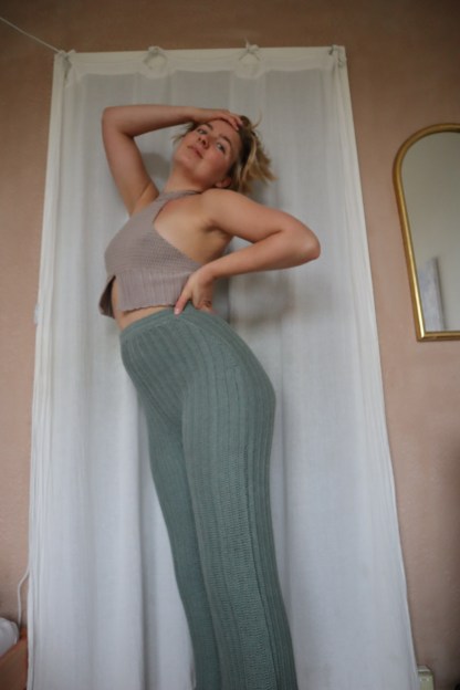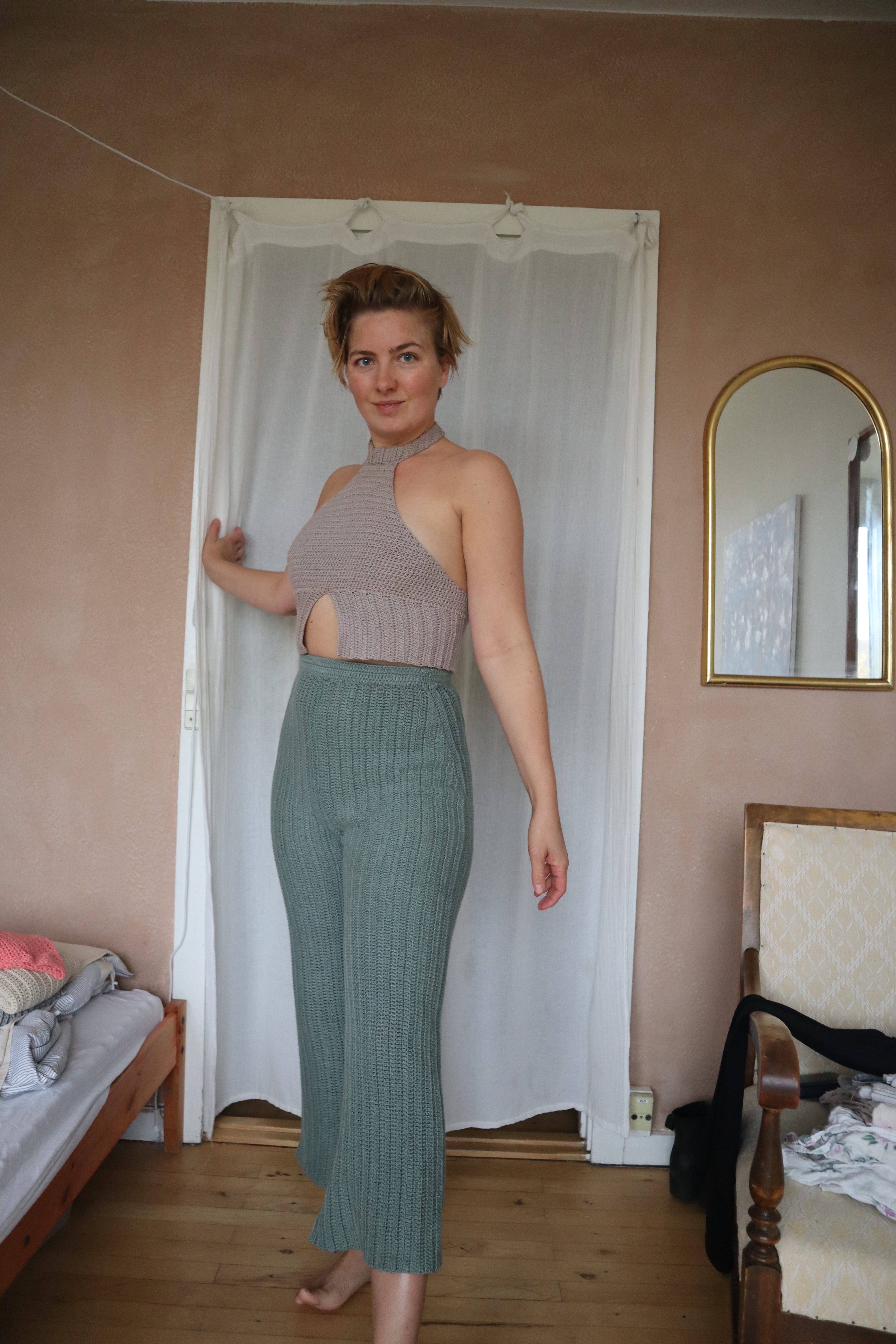 A written crochet pattern where you learn how to crochet a Y2K halterneck top with ribbed edges and front slit. The pattern has a process photo showing the different steps of the process and where to measure on your crochet.