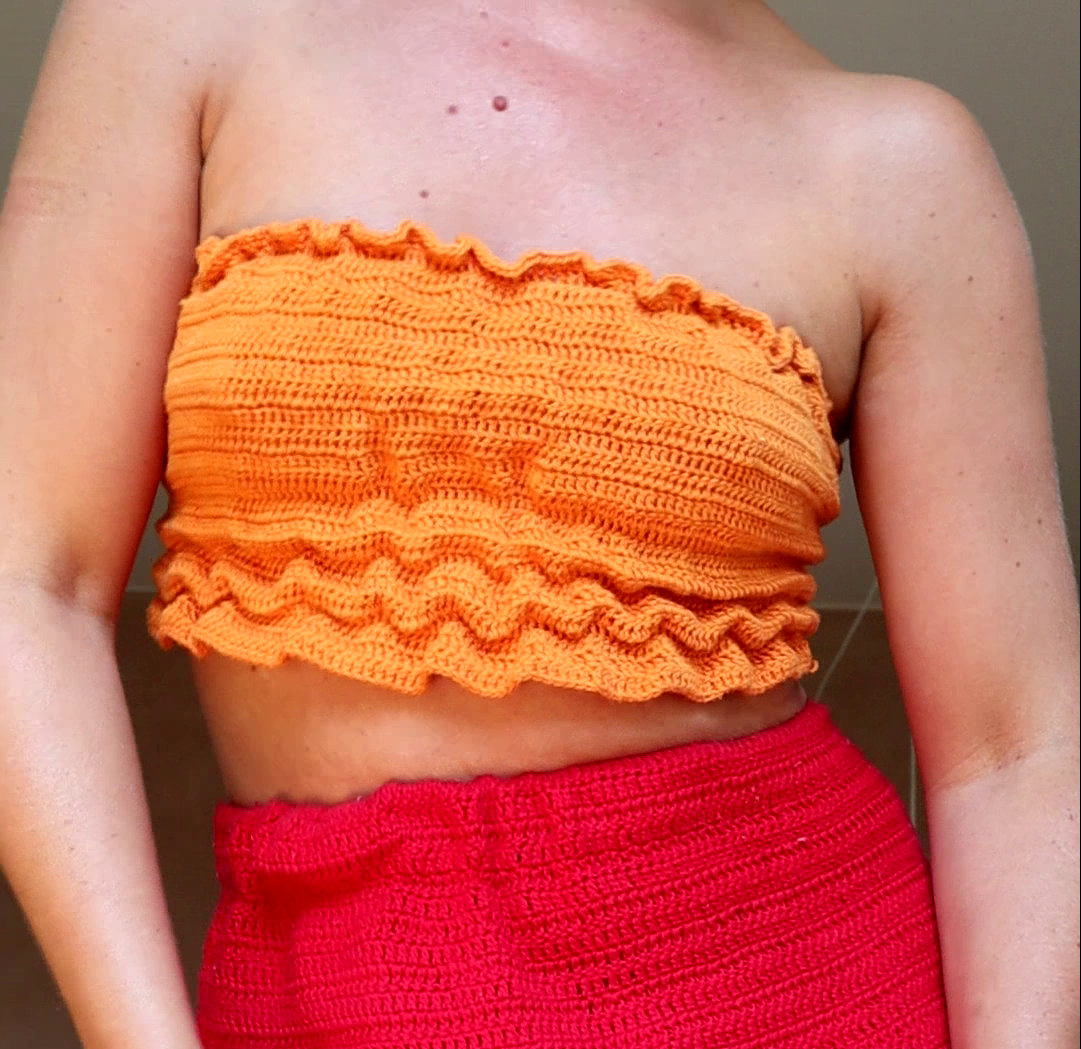 A crochet pattern where you learn how to crochet a simple smocked top with ruffle edge and elastic thread for a textured, ruched look. It also has elastic band in the top edge to hold the top in place.