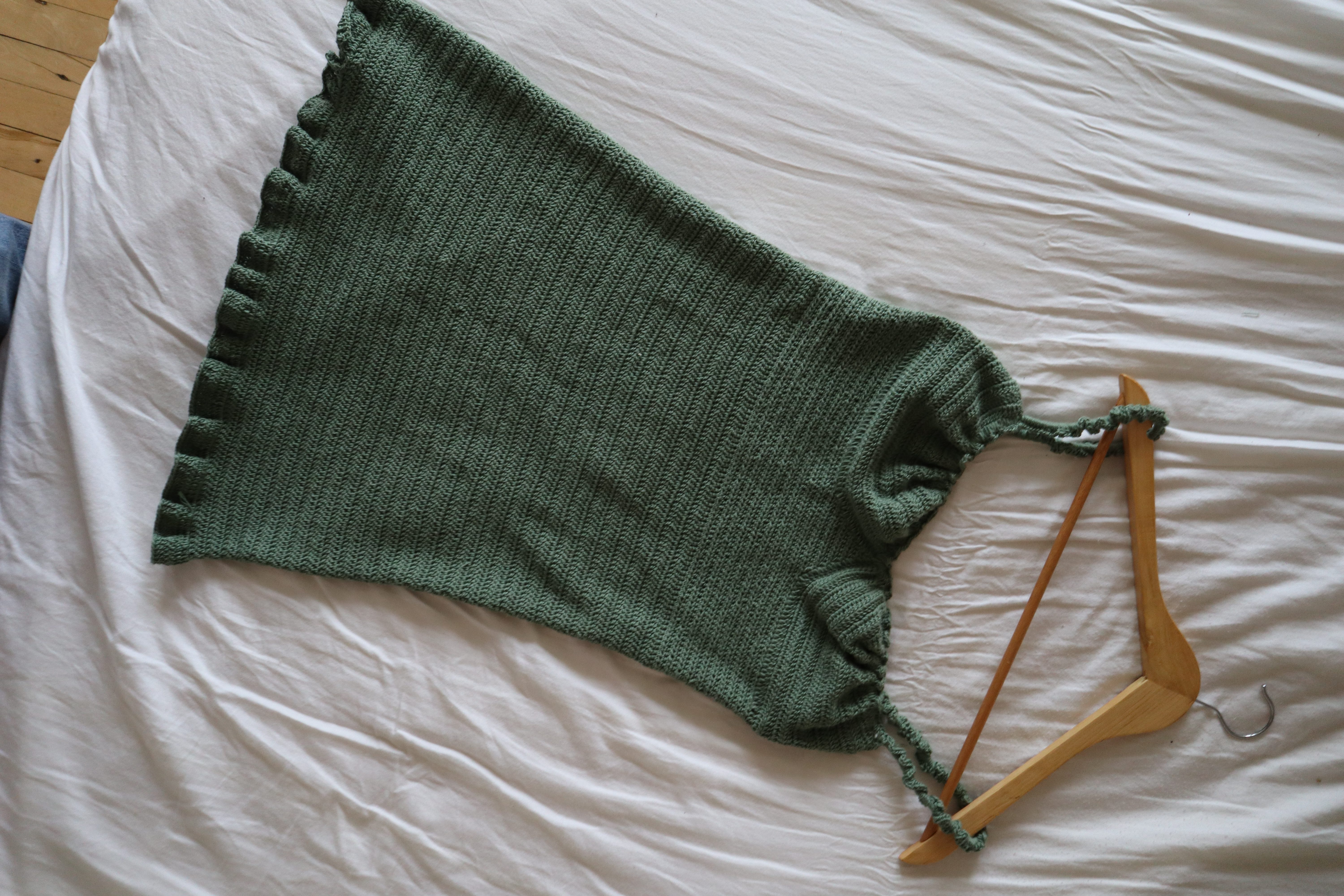 Cotton, viscose & linen blend in green. Size DK/worsted, 50 g = 120 m (link to yarn here)