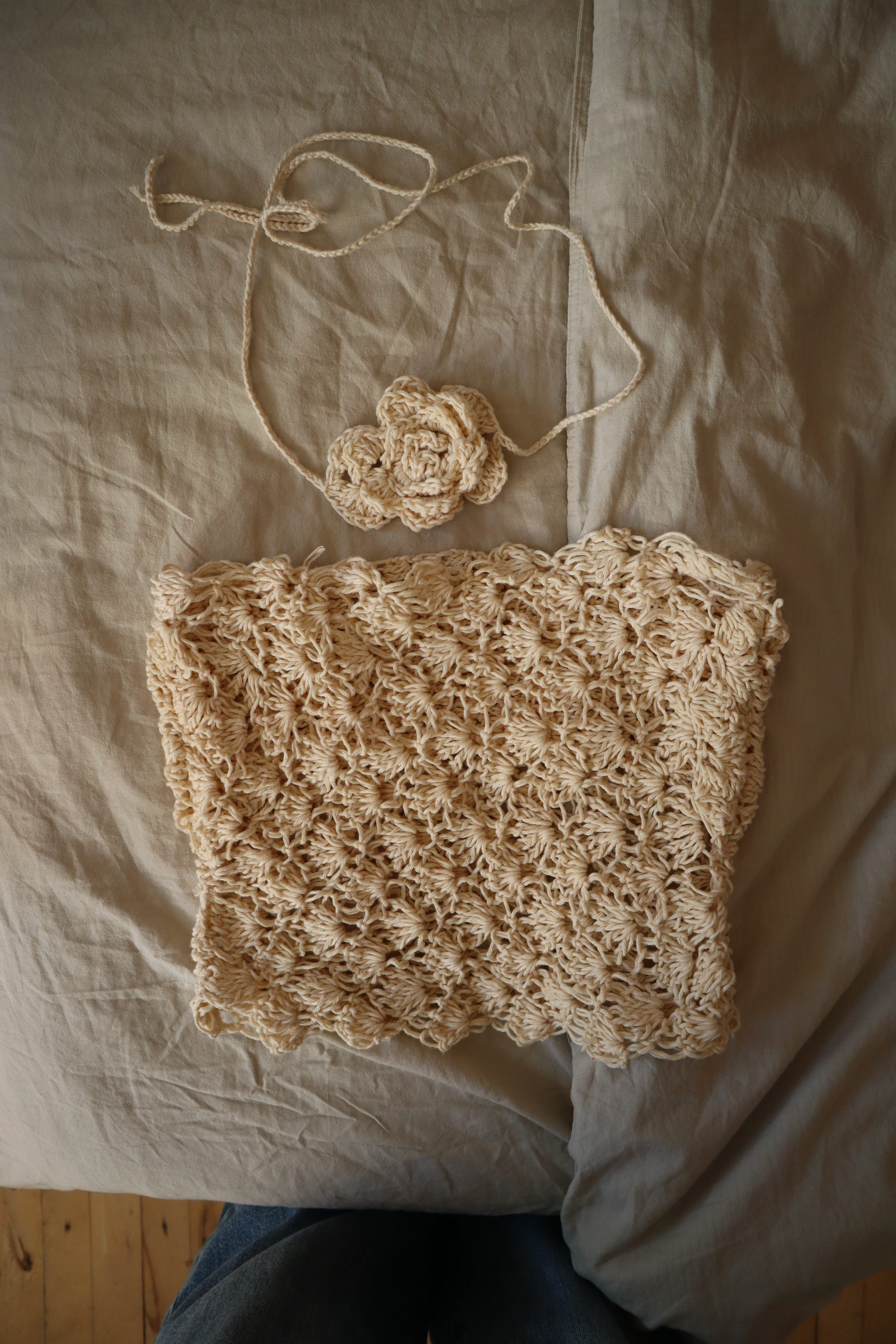 The beige top is just the top of the dress (without the hip), it is made in size 2/sport yarn and an 8 mm hook.