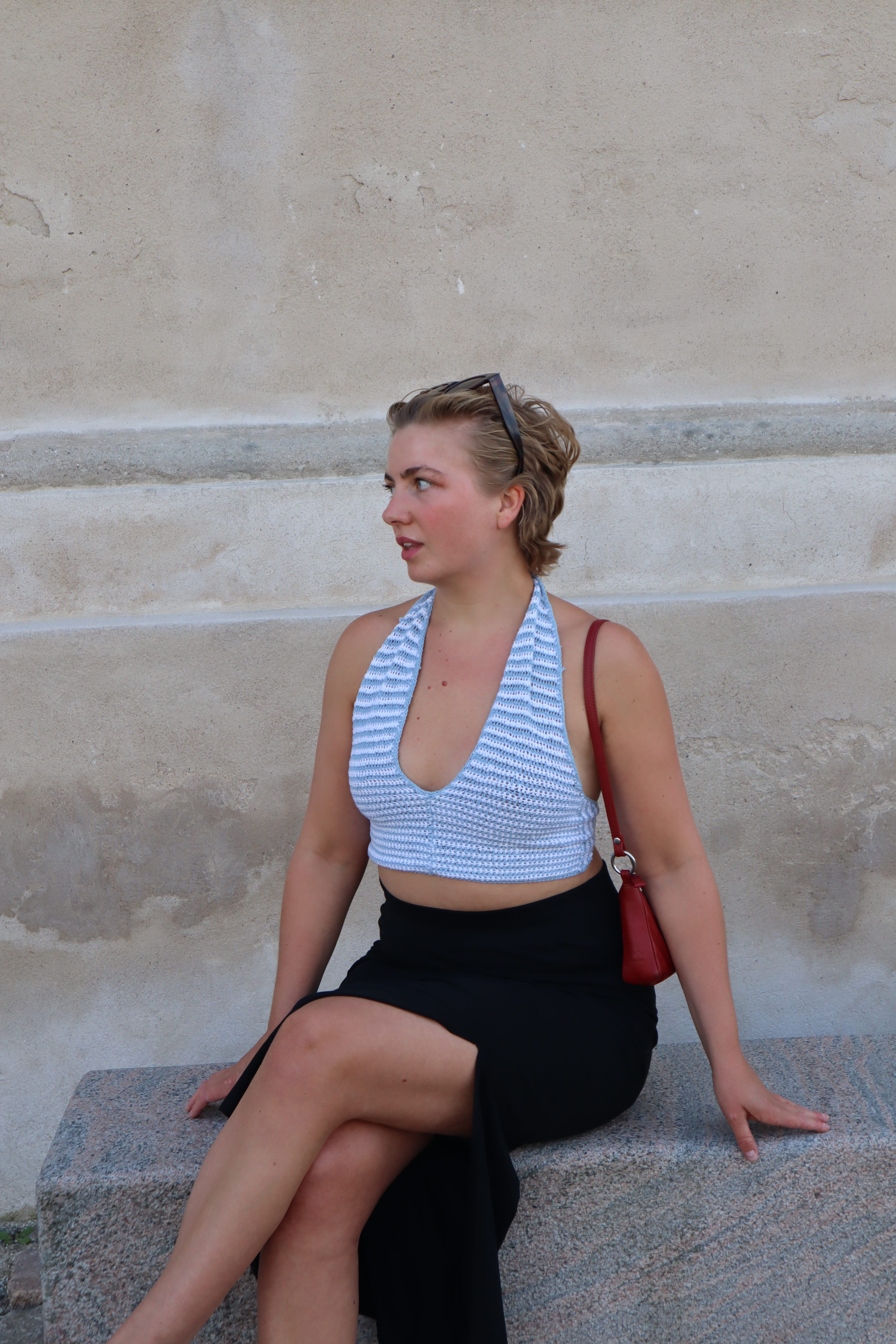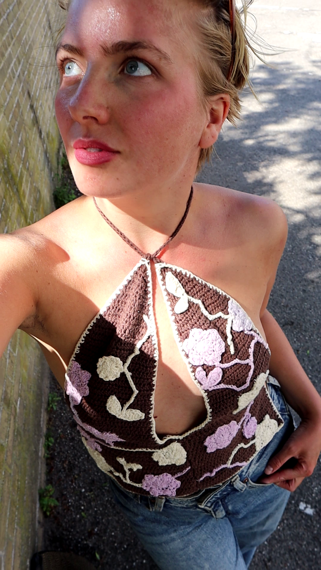 A crochet pattern on how to crochet a halterneck top with a deep plunge neckline and long ties. The pattern comes in 3 sizes.