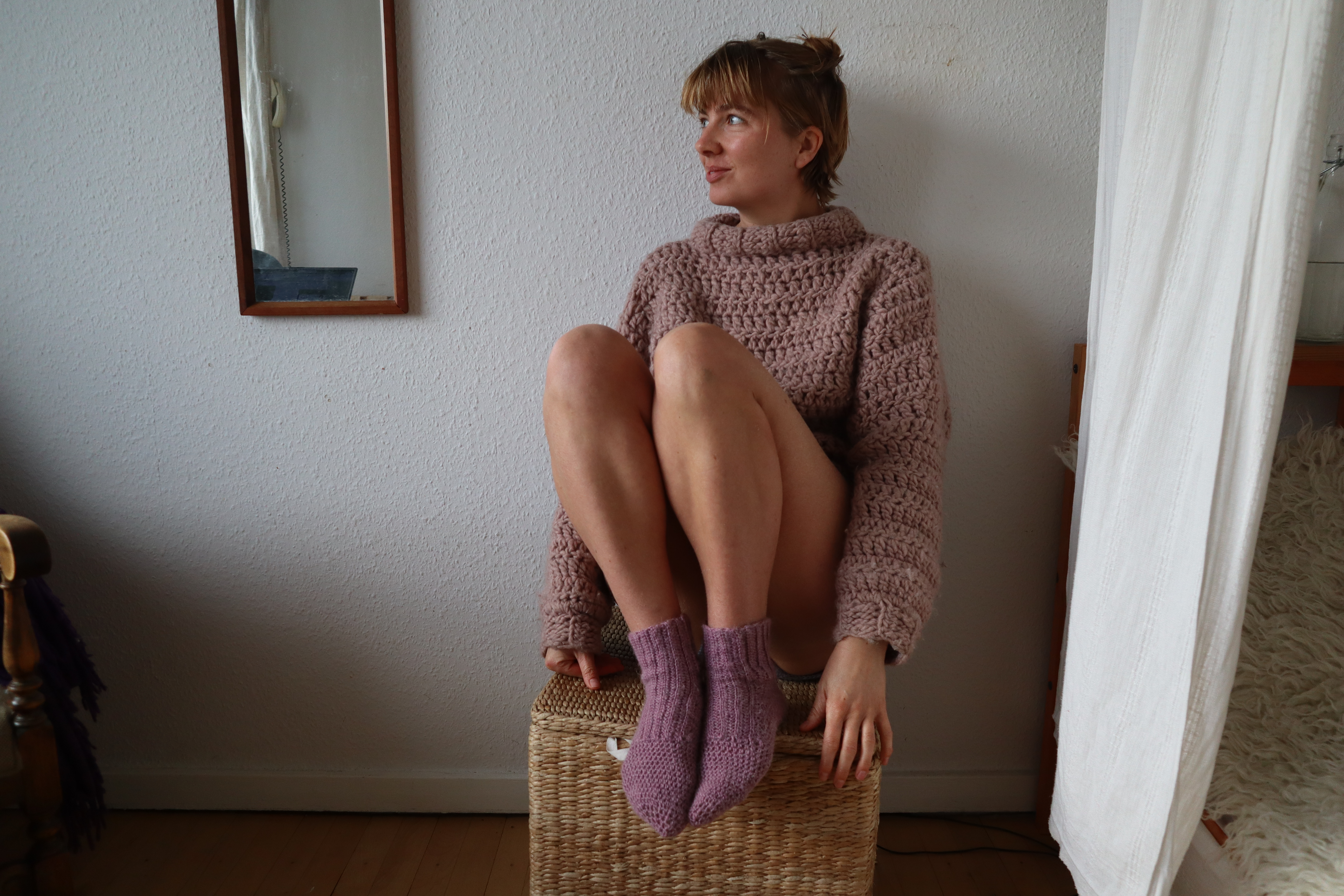 Lilac/pink socks: 66 grams of alpaca/acrylic yarn in size 2, sport, and a 3 mm hook, yardage: 50 g = 160 m (brand: Soft Alpakka)